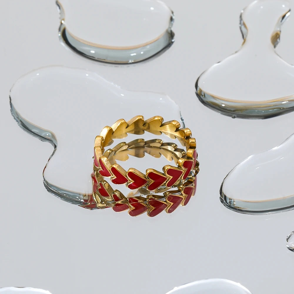 Crafted for the bold, this ring wraps your finger in red enamel hearts and waterproof gold - a love story that lasts longer than your ex.